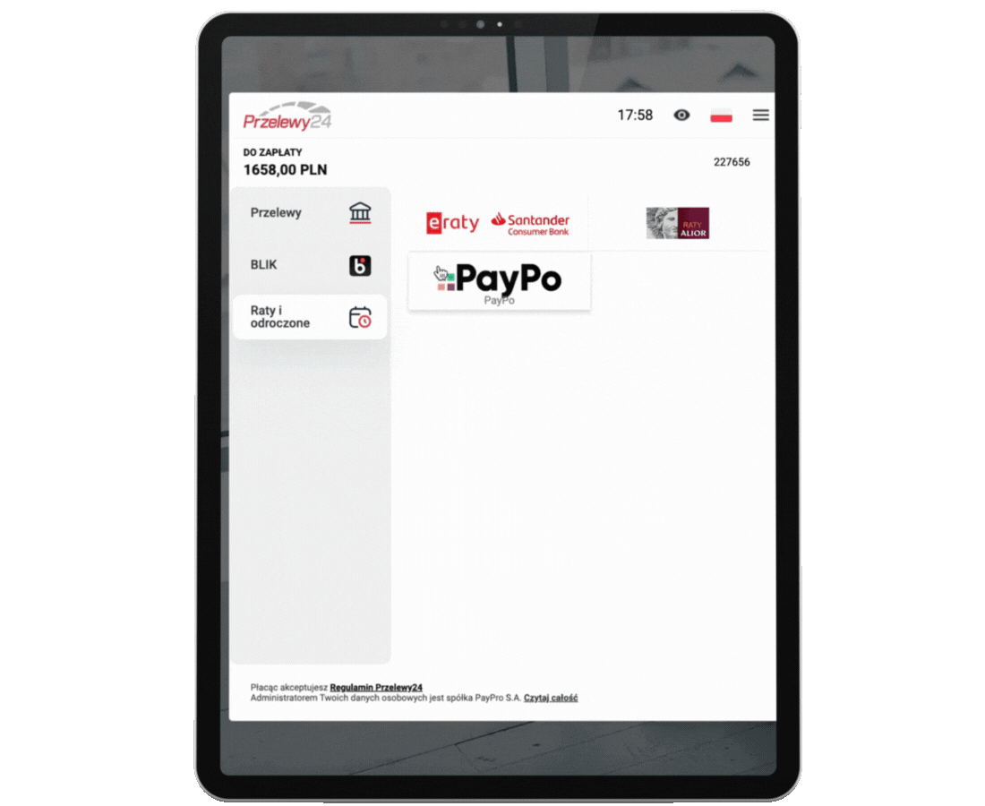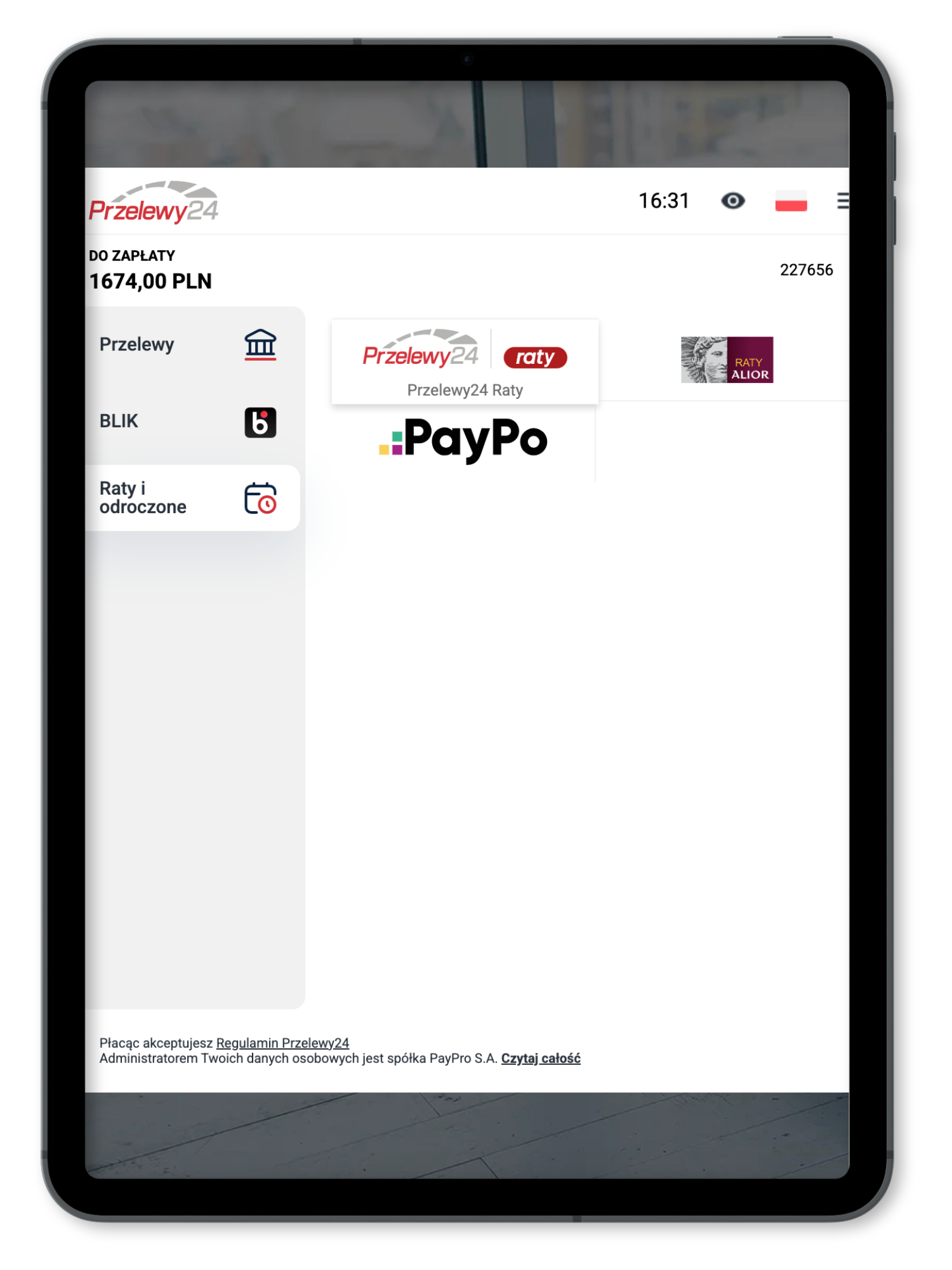 Na bramce płatności wybierz "Raty i płatności odroczone". Następnie jednego z interesujących Cię dostawców płatności PayPo, Santander, lub AliorBank. Wypełnij wniosek, a odpowiedź otrzymasz już w 15 minut! Nie zwlekaj i ciesz się wybranymi produktami już teraz w tanich, niskooprocentowanych ratach.